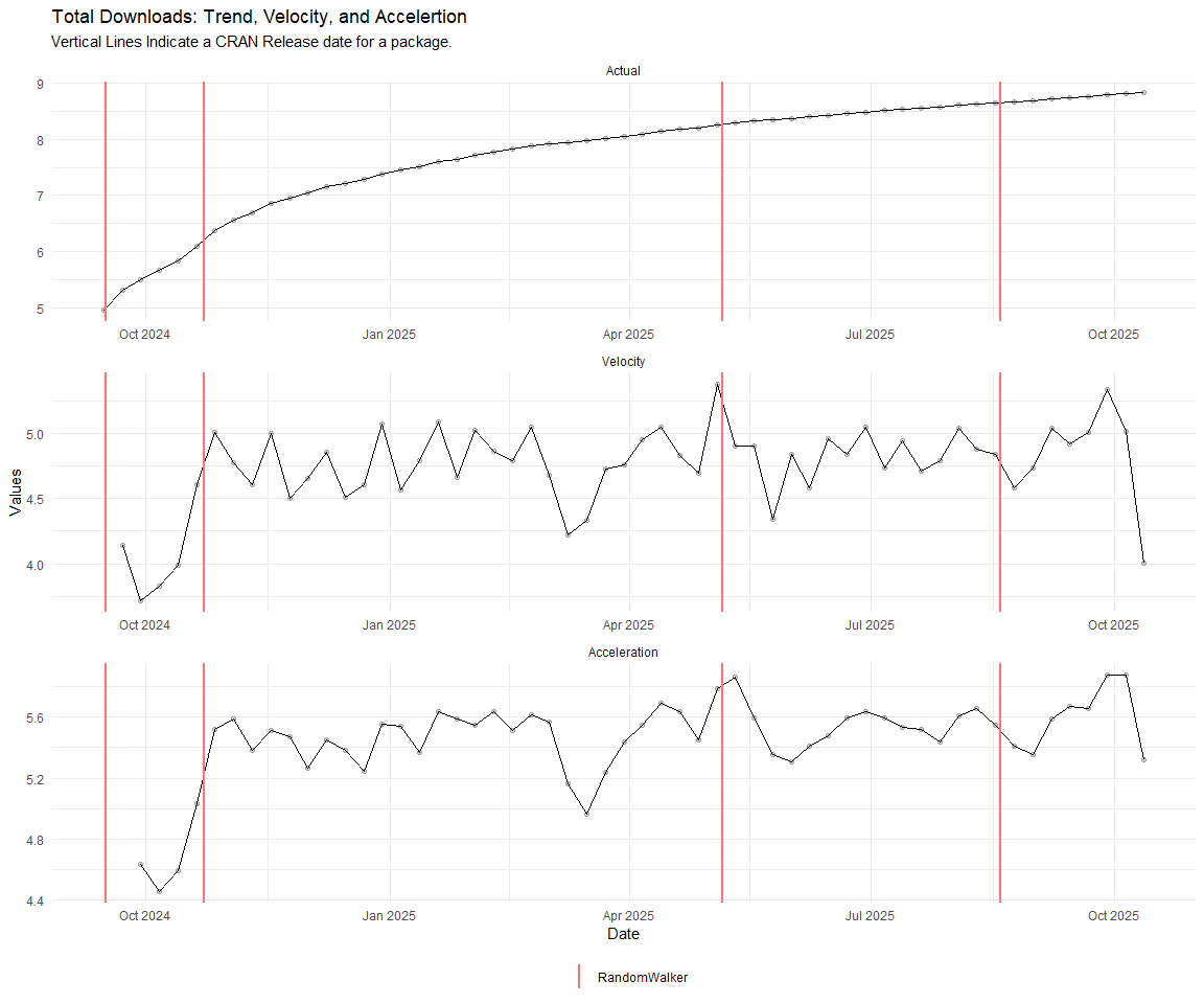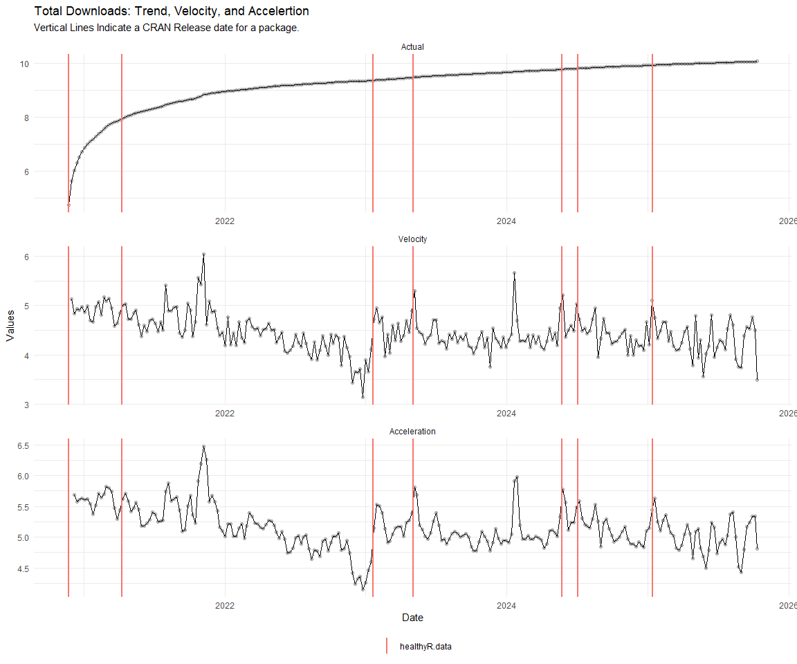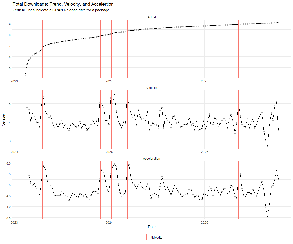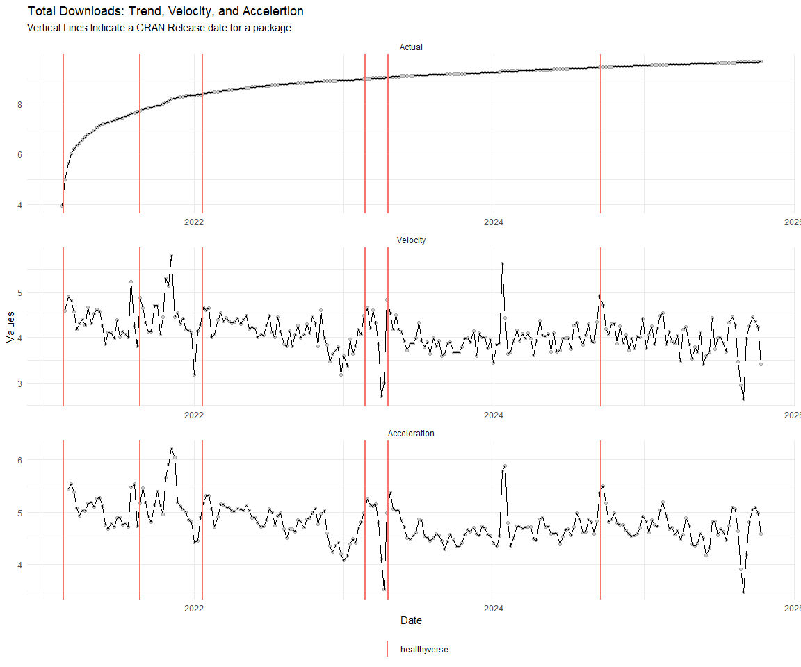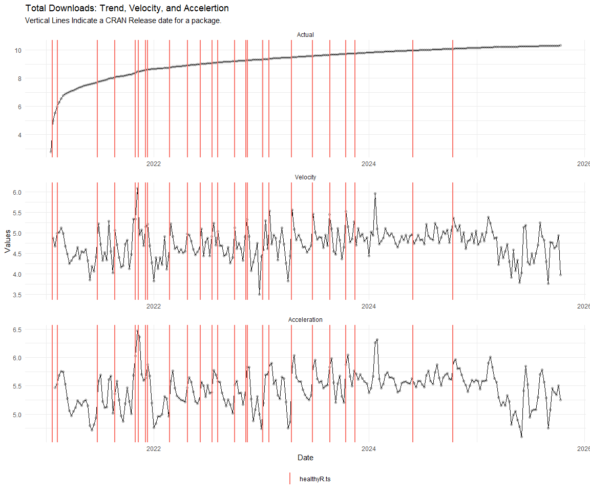 Now lets take a look at a time-series plot of the total daily downloads by package. We will use a log scale and place a vertical line at each version release for each package.