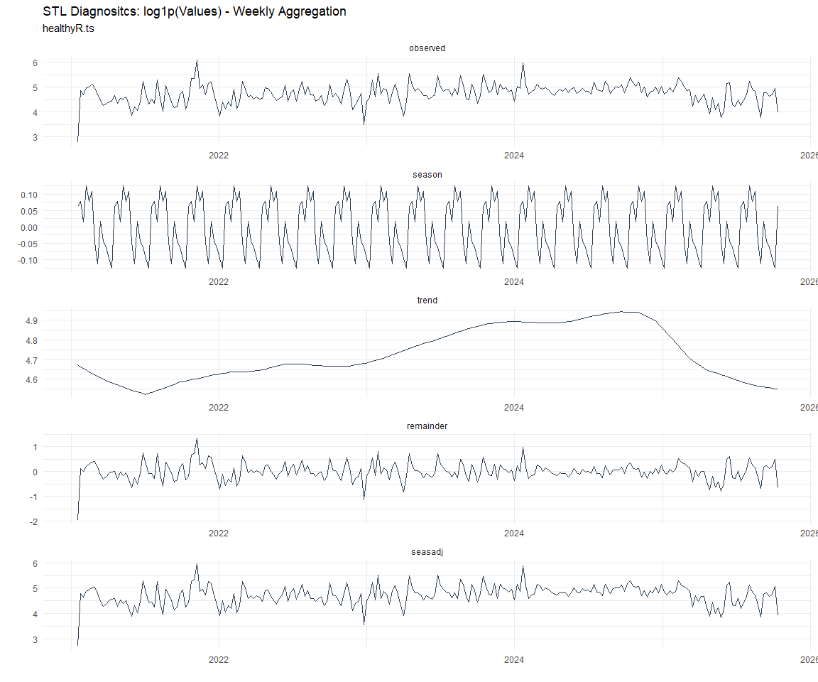 healthyR.ai | 1 | ARIMA | Test | 0.4909486 | 106.39598 | 0.8693612 | 151.2732 | 0.6219120 | 0.0042982 |