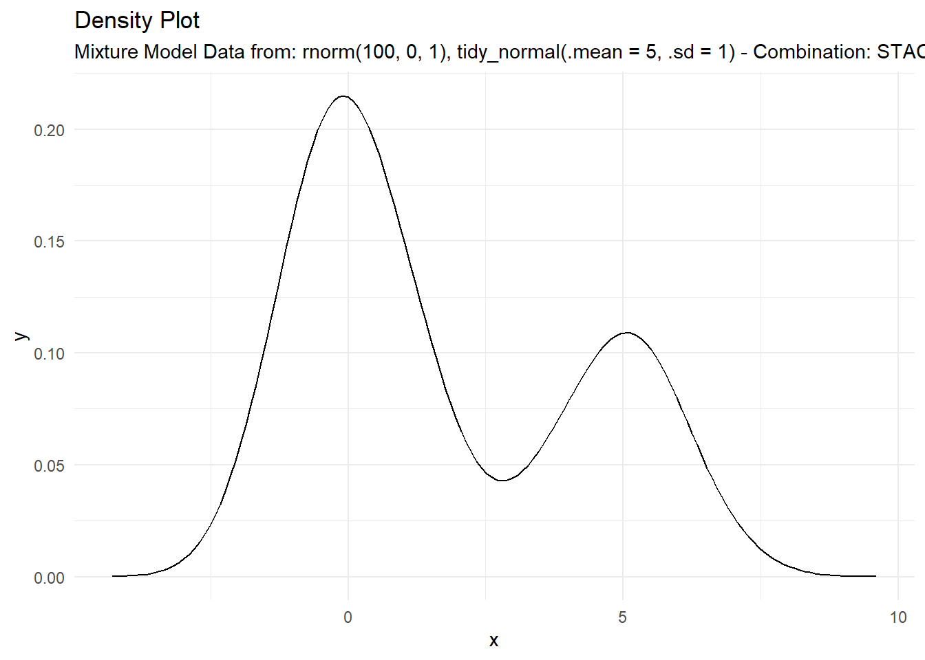 # Traditional mixture model (default behavior)mix_stack <-tidy_mixture_density(rnorm(100, 0, 1), tidy_normal(.mean =5, .sd =1),.combination_type ="stack")mix_stack